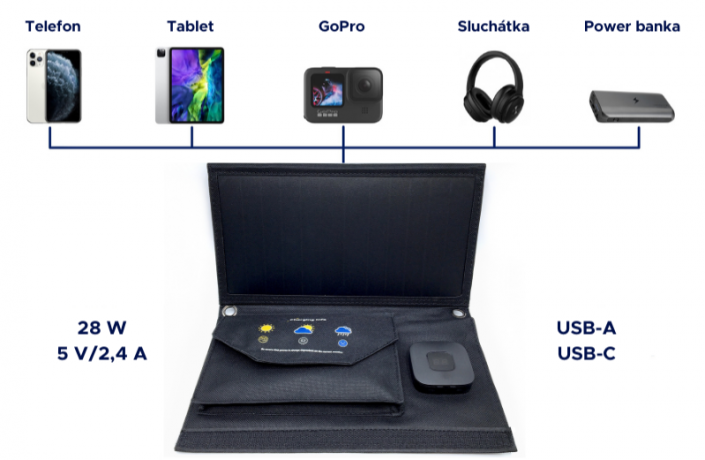 Monokrystalický solární panel SolarPower 28W 3.0 disponuje dvěma výstupy (1x USB-A, 1x USB-C) o výkonu (5 V/2,4 A). Je složen ze čtyř 7wattových panelů (celkem 28 W) s nadprůměrnou účinností 23 %. Panel dokáže dobíjet i 2 zařízení najednou, ale dodávaná energie se rozkládá a nabíjení není tolik efektivní. Výkon solárního panelu je pochopitelně přímo závislý na aktuálním počasí.